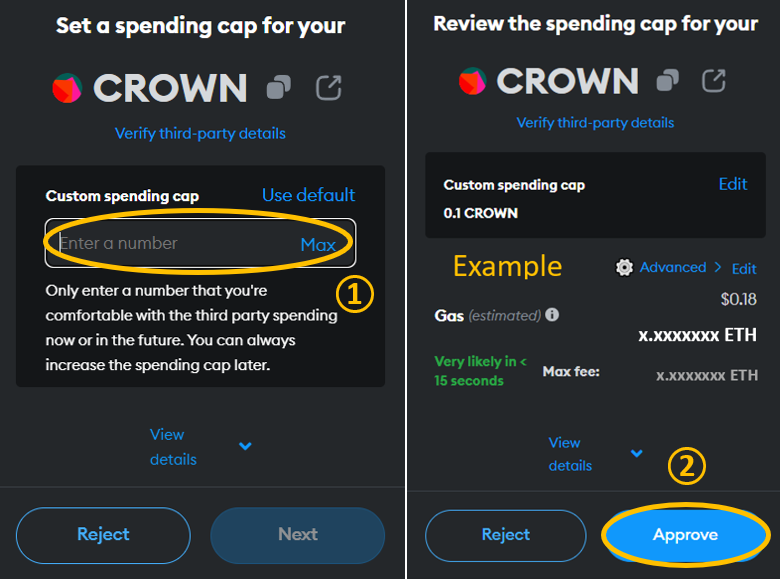 You need to set a maximum spending cap of CROWN Token (which should be at least equal to the price of the NFT you want to mint) and then you need to approve CROWN Token usage before minting an NFT by clicking on the “Approve” button.